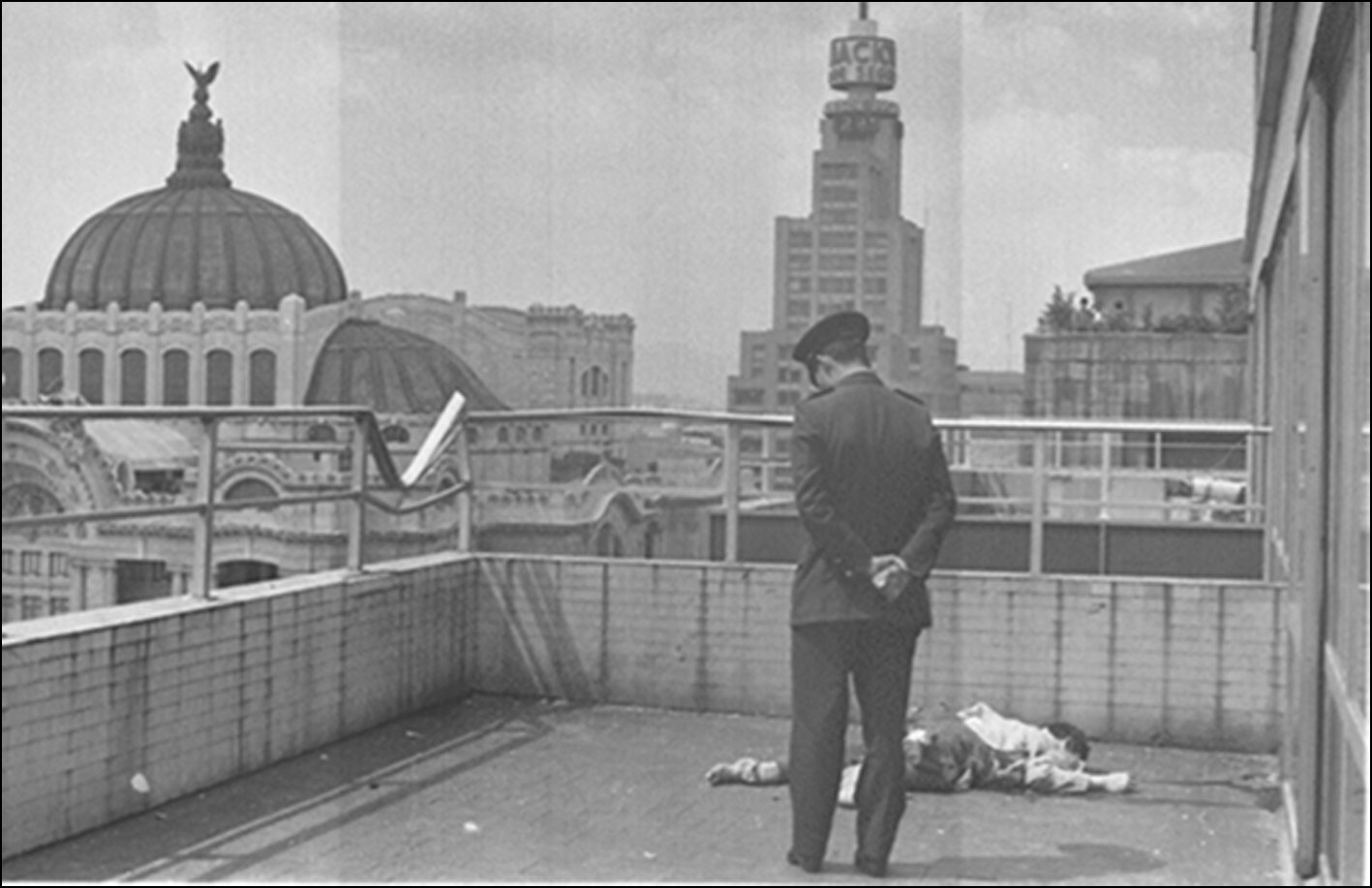 Por el momento, mi objetivo es ubicar el suicidio en la Torre Latinoamericana como un topos que sobrevive en la memoria urbana y su intersección en Sólo con tu pareja. La hipótesis se sustenta en dos casos, el primer suicidio del que obtuve registro ocurrió en 1962 (10). El segundo fue publicado en La prensa el 6 de septiembre de 1971, con la siguiente cabeza de noticia: “Desde el mirador de la Torre Latinoamericana- más de 140 metros de altura, un hombre se arrojó para suicidarse y se estrelló en el noveno piso, donde quedó destrozado” la información confirma “Este es el segundo suicidio que ocurre en el edificio más alto de la metrópoli en un lapso de nueve años” (11). El episodio fue capturado por una fotografía de Enrique Metinides que complementa la nota (Fig.1). Ambos eventos han migrado en el tiempo, en mayo de 1999 José Alberto Castro escribió para la revista Proceso: