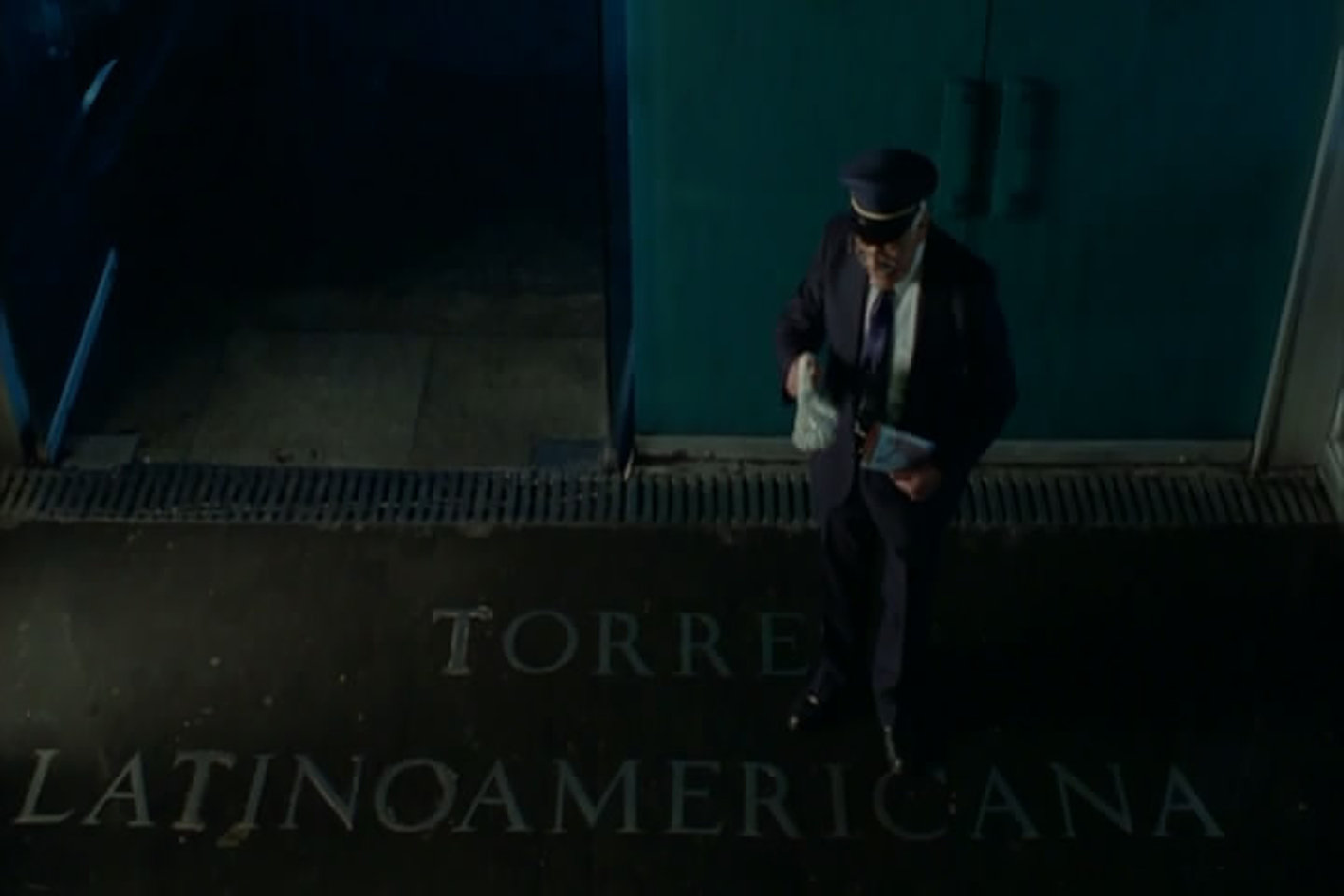 En Sólo con tu pareja la memoria de estos eventos toma voz en el cuerpo de un viejo vigilante de la Torre Latinoamericana (Fig.2). Cuando Mateo llega a la Torre acompañado de Silvia, el novio de Clarisa y una comitiva de japoneses para salvar a Tomás, Mateo pregunta al vigilante:
